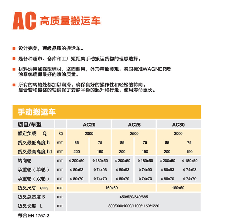 AC系列手動搬運(yùn)車專門為各種超市、倉庫等運(yùn)輸貨物而設(shè)計(jì)。材料選用加強(qiáng)型鋼材制作,堅(jiān)固耐用,外形精致美觀。