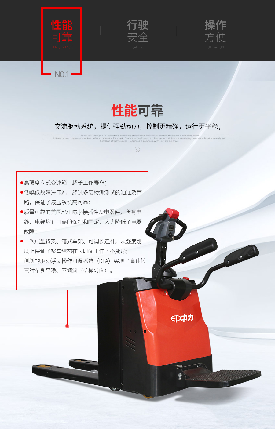重慶托盤搬運(yùn)車|全電動托盤搬運(yùn)車:美國AMP防水接插件 彎道自動減速功能
